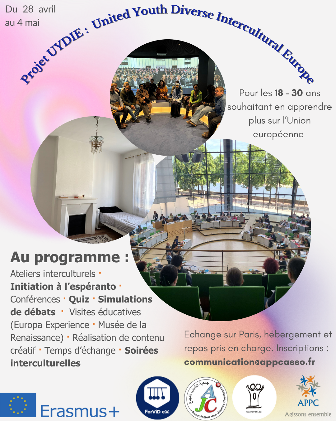 Ce mois d’avril, l’APPC lance l’échange Uydie : « United Youth Diverse Intercultural Europe ». Ce projet est réalisé en compagne de nos partenaires allemands (ForVid e.v), tunisiens (AJC) et bosniaques (Proni).